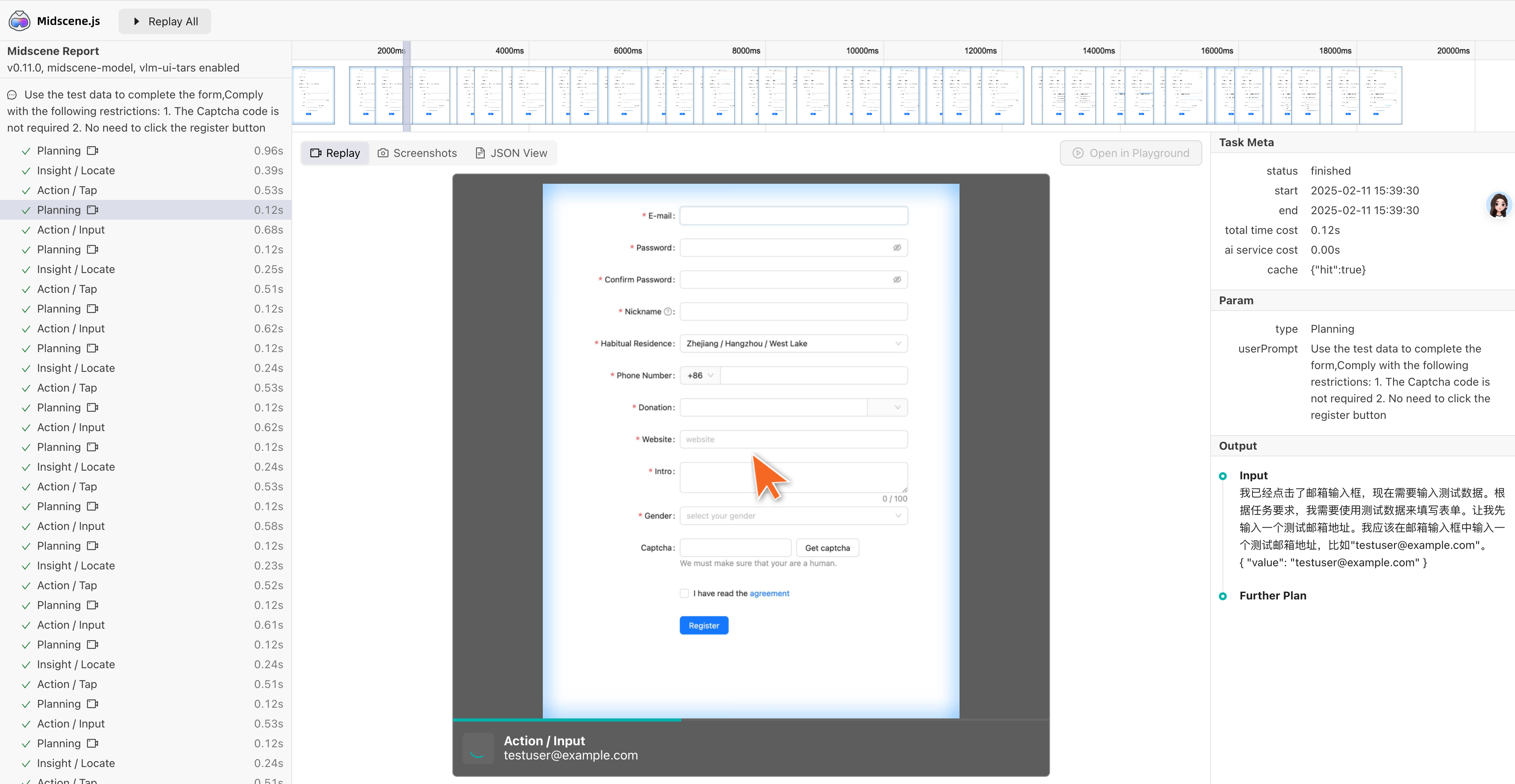On the new test report page, you can debug the AI execution results at any time, including page operations, page information extraction, and page assertions.